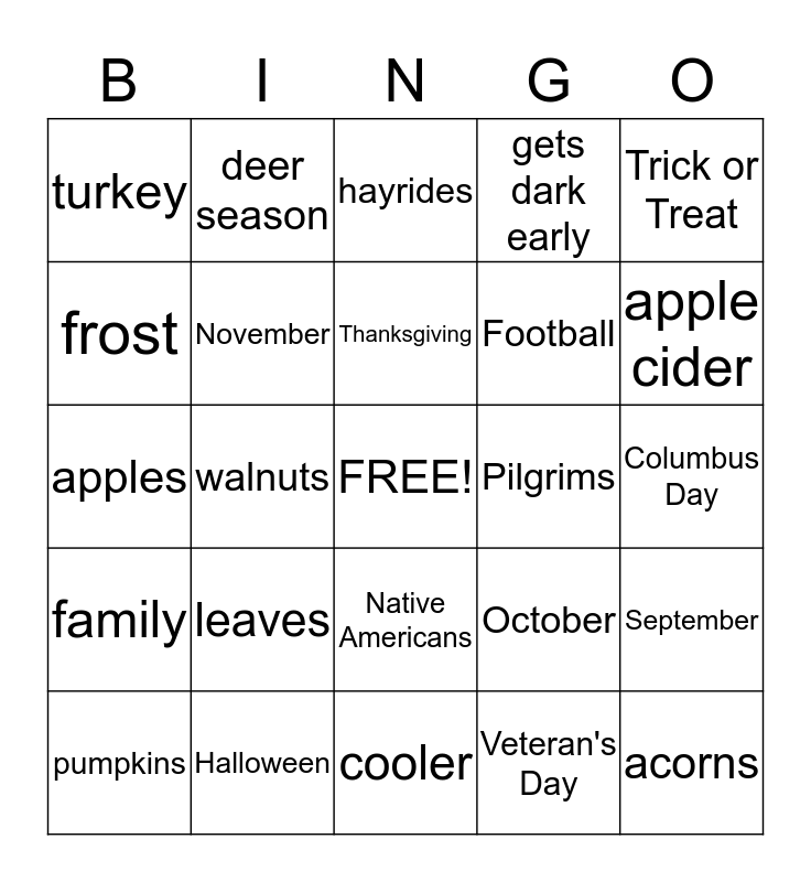 This bingo card has a free space and 24 words: leaves, Halloween, Thanksgiving, pumpkins, Trick or Treat, turkey, frost, deer season, Pilgrims, Native Americans, Football, apples, October, September, November, Veteran's Day, Columbus Day, hayrides, apple cider, walnuts, acorns, family, gets dark early and cooler.