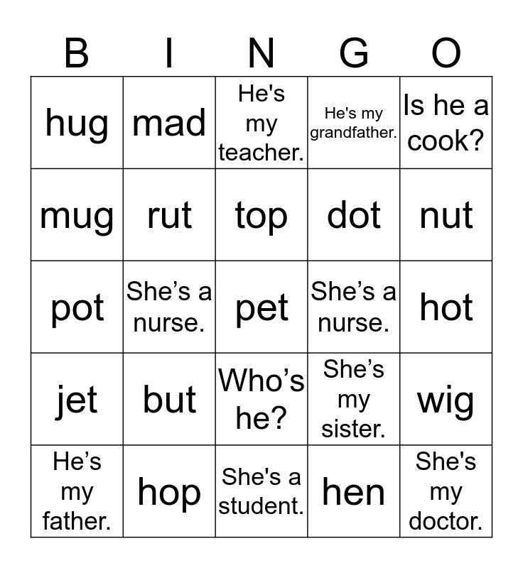 This bingo card has a free space and 24 words: but, hop, top, He’s my father., Is he a cook?, hug, mug, mad, She’s a nurse., Who’s he?, dot, pot, She’s my sister., wig, rut, hen, hot, He's my teacher., nut, She’s a nurse., She's my doctor., jet, He's my grandfather. and She's a student..