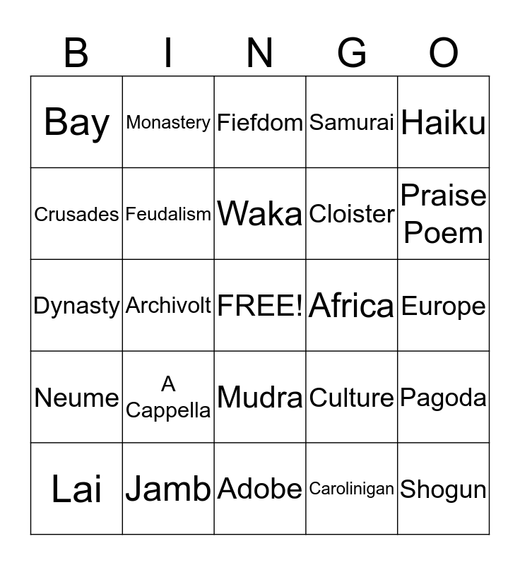 This bingo card has a free space and 24 words: A Cappella, Jamb, Waka, Lai, Haiku, Bay, Crusades, Monastery, Africa, Mudra, Cloister, Dynasty, Culture, Pagoda, Feudalism, Carolinigan, Europe, Fiefdom, Praise Poem, Archivolt, Shogun, Neume, Samurai and Adobe.