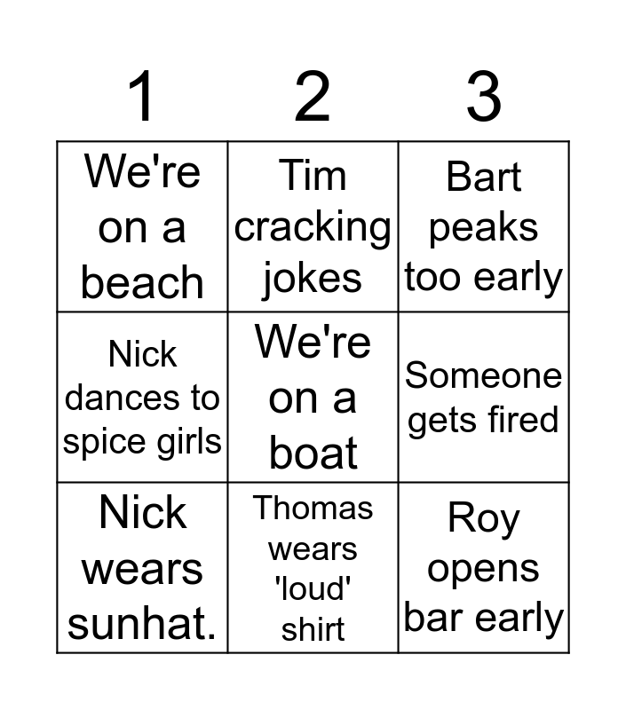 This bingo card has 9 words: Nick wears sunhat., Bart peaks too early, Tim cracking jokes, Nick dances to spice girls, We're on a beach, Someone gets fired, We're on a boat, Roy opens bar early and Thomas wears 'loud' shirt.