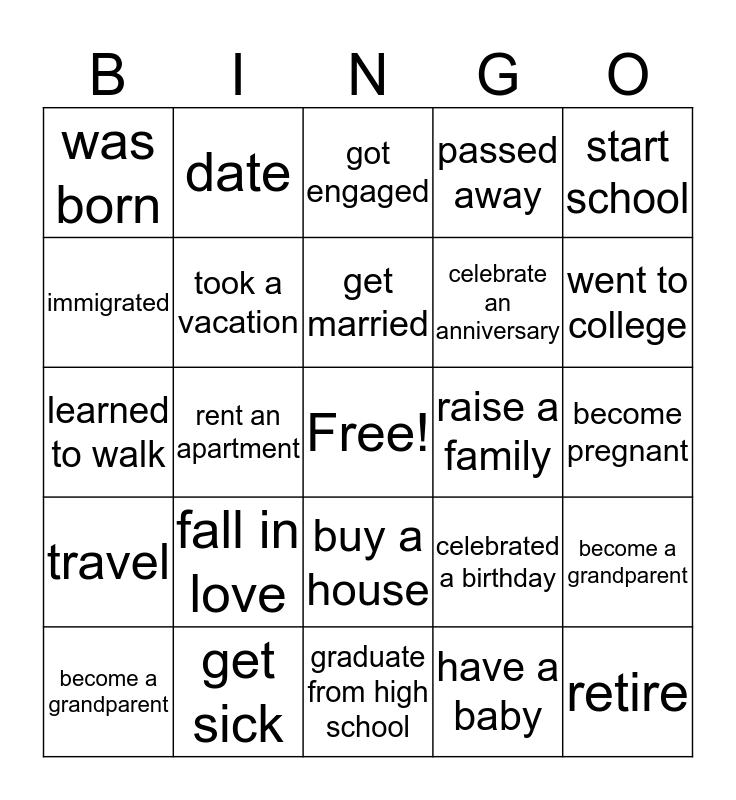 This bingo card has a free space and 24 words: fall in love, get sick, get married, become a grandparent, start school, was born, immigrated, date, raise a family, buy a house, celebrate an anniversary, learned to walk, celebrated a birthday, become a grandparent, took a vacation, have a baby, become pregnant, got engaged, went to college, rent an apartment, retire, travel, passed away and graduate from high school.
