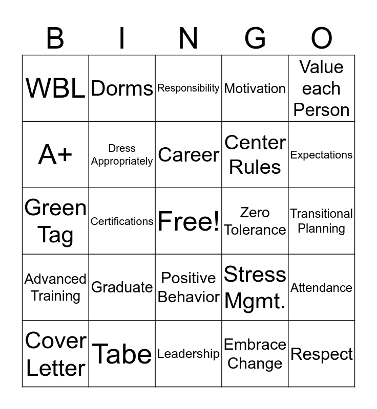 This bingo card has a free space and 24 words: Graduate, Tabe, Career, Cover Letter, Value each Person, WBL, A+, Dorms, Zero Tolerance, Positive Behavior, Center Rules, Green Tag, Stress Mgmt., Attendance, Dress Appropriately, Embrace Change, Transitional Planning, Responsibility, Expectations, Certifications, Respect, Advanced Training, Motivation and Leadership.