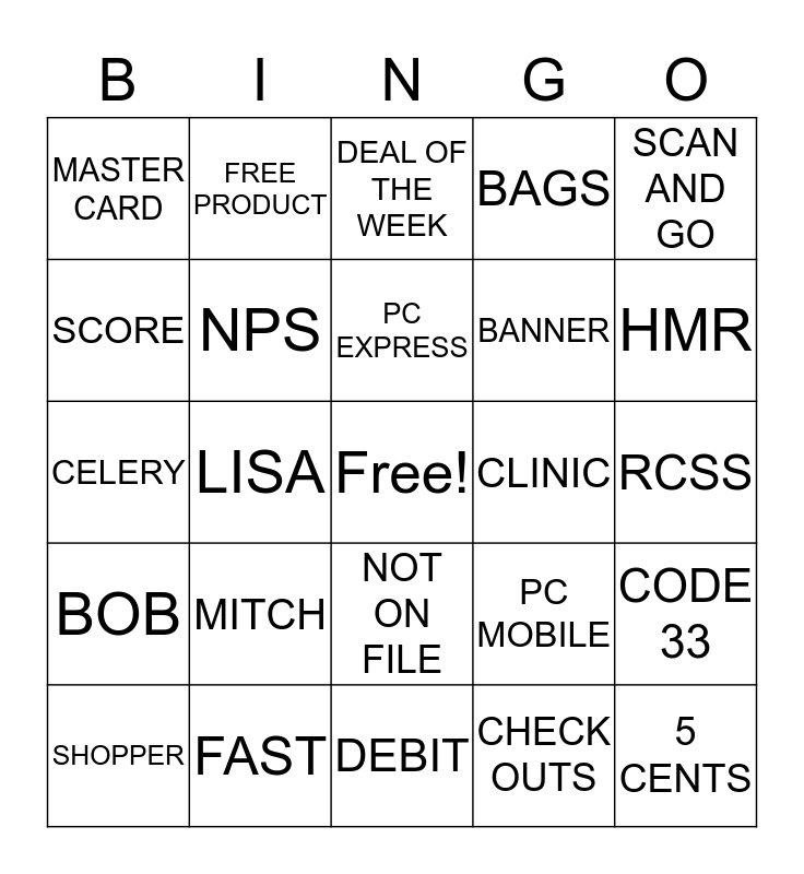 This bingo card has a free space and 24 words: MITCH, FAST, PC EXPRESS, SHOPPER, SCAN AND GO, MASTER CARD, SCORE, FREE PRODUCT, CLINIC, NOT ON FILE, BANNER, CELERY, PC MOBILE, CODE 33, NPS, CHECK OUTS, RCSS, DEAL OF THE WEEK, HMR, LISA, 5 CENTS, BOB, BAGS and DEBIT.