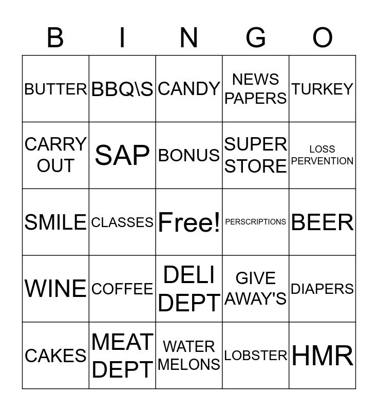 This bingo card has a free space and 24 words: COFFEE, MEAT DEPT, BONUS, CAKES, TURKEY, BUTTER, CARRY OUT, BBQ\S, PERSCRIPTIONS, DELI DEPT, SUPER STORE, SMILE, GIVE AWAY'S, DIAPERS, SAP, LOBSTER, BEER, CANDY, LOSS PERVENTION, CLASSES, HMR, WINE, NEWS PAPERS and WATER MELONS.