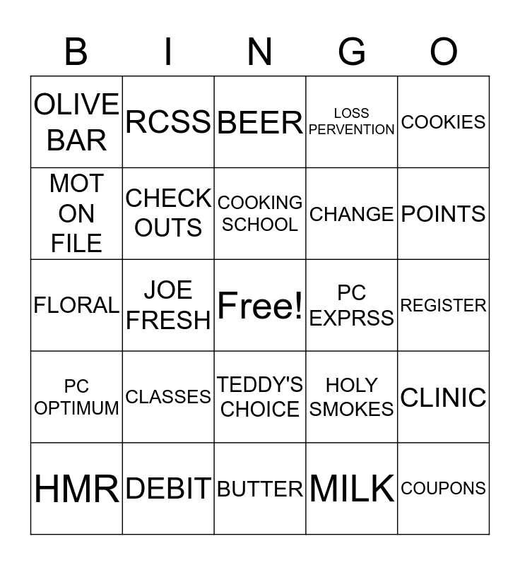 This bingo card has a free space and 24 words: CLASSES, DEBIT, COOKING SCHOOL, HMR, COOKIES, OLIVE BAR, MOT ON FILE, RCSS, PC EXPRSS, TEDDY'S CHOICE, CHANGE, FLORAL, HOLY SMOKES, CLINIC, CHECK OUTS, MILK, REGISTER, BEER, POINTS, JOE FRESH, COUPONS, PC OPTIMUM, LOSS PERVENTION and BUTTER.