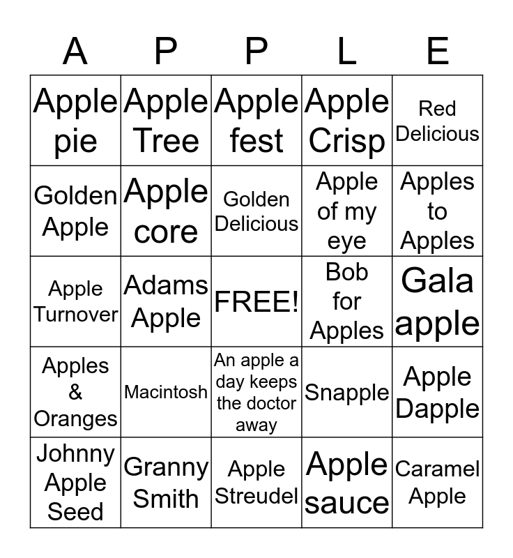 This bingo card has a free space and 24 words: Macintosh, Granny Smith, Golden Delicious, Johnny Apple Seed, Red Delicious, Apple pie, Golden Apple, Apple Tree, Bob for Apples, An apple a day keeps the doctor away, Apple of my eye, Apple Turnover, Snapple, Apple Dapple, Apple core, Apple sauce, Gala apple, Apple fest, Apples to Apples, Adams Apple, Caramel Apple, Apples & Oranges, Apple Crisp and Apple Streudel.