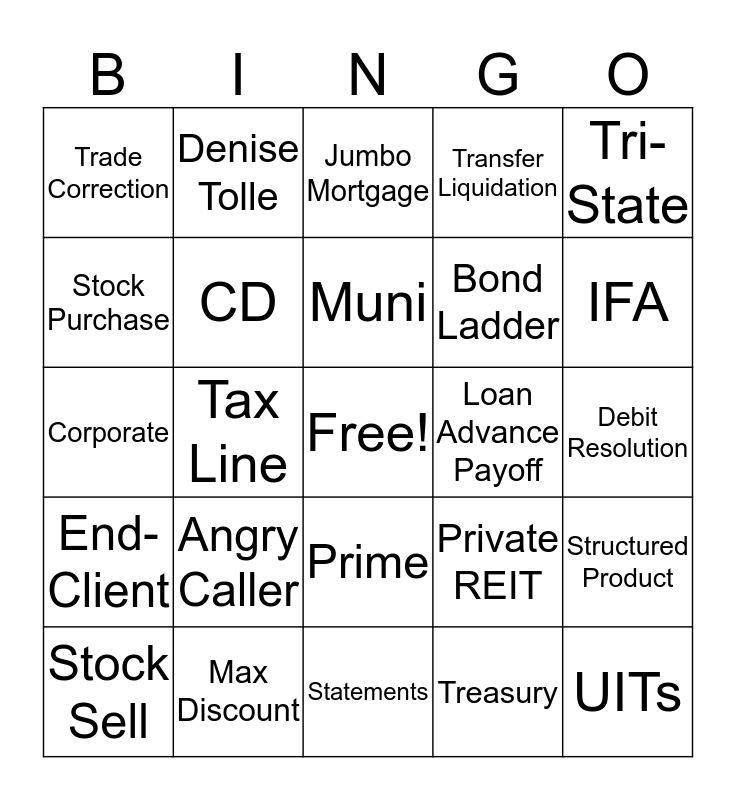 This bingo card has a free space and 24 words: Angry Caller, Max Discount, Muni, Stock Sell, Tri-State, Trade Correction, Stock Purchase, Denise Tolle, Loan Advance Payoff, Prime, Bond Ladder, Corporate, Private REIT, Structured Product, CD, Treasury, Debit Resolution, Jumbo Mortgage, IFA, Tax Line, UITs, End-Client, Transfer Liquidation and Statements.