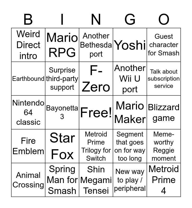 This bingo card has a free space and 24 words: Star Fox, Spring Man for Smash, F-Zero, Animal Crossing, Guest character for Smash, Weird Direct intro, Earthbound, Mario RPG, Mario Maker, Metroid Prime Trilogy for Switch, Another Wii U port, Nintendo 64 classic, Segment that goes on for way too long, Meme-worthy Reggie moment, Surprise third-party support, New way to play / peripheral, Blizzard game, Another Bethesda port, Talk about subscription service, Bayonetta 3, Metroid Prime 4, Fire Emblem, Yoshi and Shin Megami Tensei.