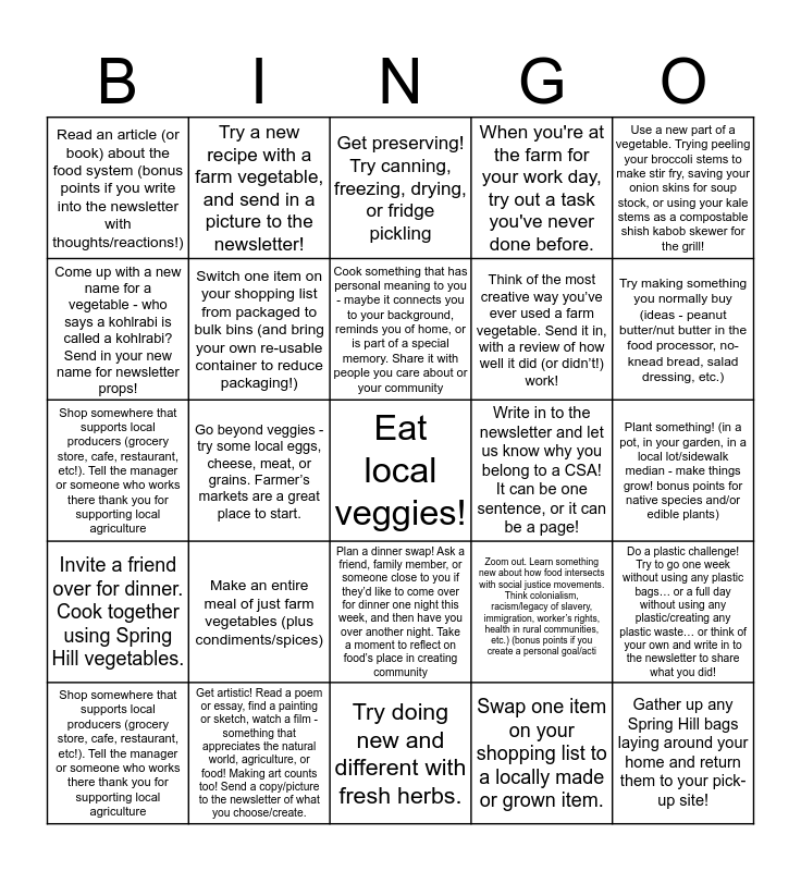 This bingo card has a free space and 24 words: Make an entire meal of just farm vegetables (plus condiments/spices), Get artistic! Read a poem or essay, find a painting or sketch, watch a film - something that appreciates the natural world, agriculture, or food! Making art counts too! Send a copy/picture to the newsletter of what you choose/create., Cook something that has personal meaning to you - maybe it connects you to your background, reminds you of home, or is part of a special memory. Share it with people you care about or your community, Shop somewhere that supports local producers (grocery store, cafe, restaurant, etc!). Tell the manager or someone who works there thank you for supporting local agriculture, Use a new part of a vegetable. Trying peeling your broccoli stems to make stir fry, saving your onion skins for soup stock, or using your kale stems as a compostable shish kabob skewer for the grill!, Read an article (or book) about the food system (bonus points if you write into the newsletter with thoughts/reactions!), Come up with a new name for a vegetable - who says a kohlrabi is called a kohlrabi? Send in your new name for newsletter props!, Try a new recipe with a farm vegetable, and send in a picture to the newsletter!, Write in to the newsletter and let us know why you belong to a CSA! It can be one sentence, or it can be a page!, Plan a dinner swap! Ask a friend, family member, or someone close to you if they’d like to come over for dinner one night this week, and then have you over another night. Take a moment to reflect on food’s place in creating community, Think of the most creative way you’ve ever used a farm vegetable. Send it in, with a review of how well it did (or didn’t!) work!, Shop somewhere that supports local producers (grocery store, cafe, restaurant, etc!). Tell the manager or someone who works there thank you for supporting local agriculture, Zoom out. Learn something new about how food intersects with social justice movements. Think colonialism, racism/legacy of slavery, immigration, worker’s rights, health in rural communities, etc.) (bonus points if you create a personal goal/acti, Do a plastic challenge! Try to go one week without using any plastic bags… or a full day without using any plastic/creating any plastic waste… or think of your own and write in to the newsletter to share what you did!, Switch one item on your shopping list from packaged to bulk bins (and bring your own re-usable container to reduce packaging!), Swap one item on your shopping list to a locally made or grown item., Plant something! (in a pot, in your garden, in a local lot/sidewalk median - make things grow! bonus points for native species and/or edible plants), Get preserving! Try canning, freezing, drying, or fridge pickling, Try making something you normally buy (ideas - peanut butter/nut butter in the food processor, no-knead bread, salad dressing, etc.), Go beyond veggies - try some local eggs, cheese, meat, or grains. Farmer’s markets are a great place to start., Gather up any Spring Hill bags laying around your home and return them to your pick-up site!, Invite a friend over for dinner. Cook together using Spring Hill vegetables., When you're at the farm for your work day, try out a task you've never done before. and Try doing new and different with fresh herbs..