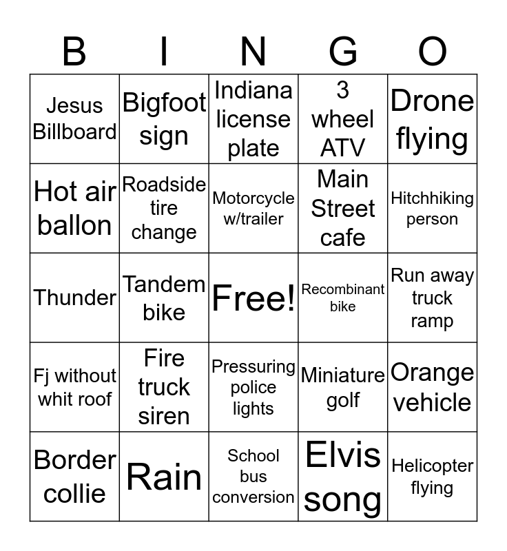 This bingo card has a free space and 34 words: Yellow VW Beetle, Elvis song, Someone says "amazing", Extreme overland vehicle, Fj without whit roof, Roadside tire change, Drone flying, Border collie, Bigfoot sign, Hero5 on side of truck, Motorcycle w/trailer, Indiana license plate, Canada license plate, 7-11 store, Recombinant bike, Hitchhiking person, Rain, Thunder, Fire truck siren, Miniature golf, Pressuring police lights, "Named" restaurant, Jesus Billboard, Run away truck ramp, School bus conversion, Helicopter flying, 3 wheel ATV, Personalized plate w/# (28), Main Street cafe, Hot air ballon, Mile marker 69, Tandem bike, Orange vehicle and Mormon church.