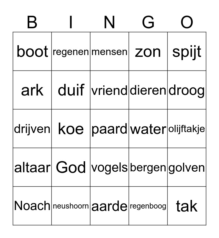 This bingo card has 25 words: God, aarde, vriend, Noach, spijt, boot, ark, regenen, water, vogels, dieren, drijven, bergen, golven, duif, tak, olijftakje, mensen, droog, koe, paard, neushoorn, altaar, zon and regenboog.