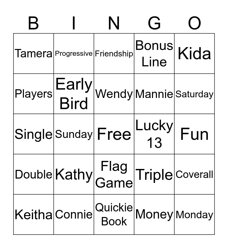 This bingo card has a free space and 24 words: Kathy, Connie, Wendy, Keitha, Kida, Tamera, Players, Progressive, Lucky 13, Flag Game, Mannie, Single, Triple, Coverall, Early Bird, Money, Fun, Friendship, Saturday, Sunday, Monday, Double, Bonus Line and Quickie Book.