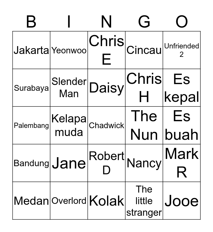 This bingo card has 25 words: Bandung, Overlord, Chadwick, The little stranger, Unfriended 2, Jakarta, Yeonwoo, Chris E, The Nun, Mark R, Surabaya, Slender Man, Kolak, Nancy, Es kepal, Medan, Kelapa muda, Daisy, Chris H, Es buah, Palembang, Jane, Robert D, Cincau and Jooe.