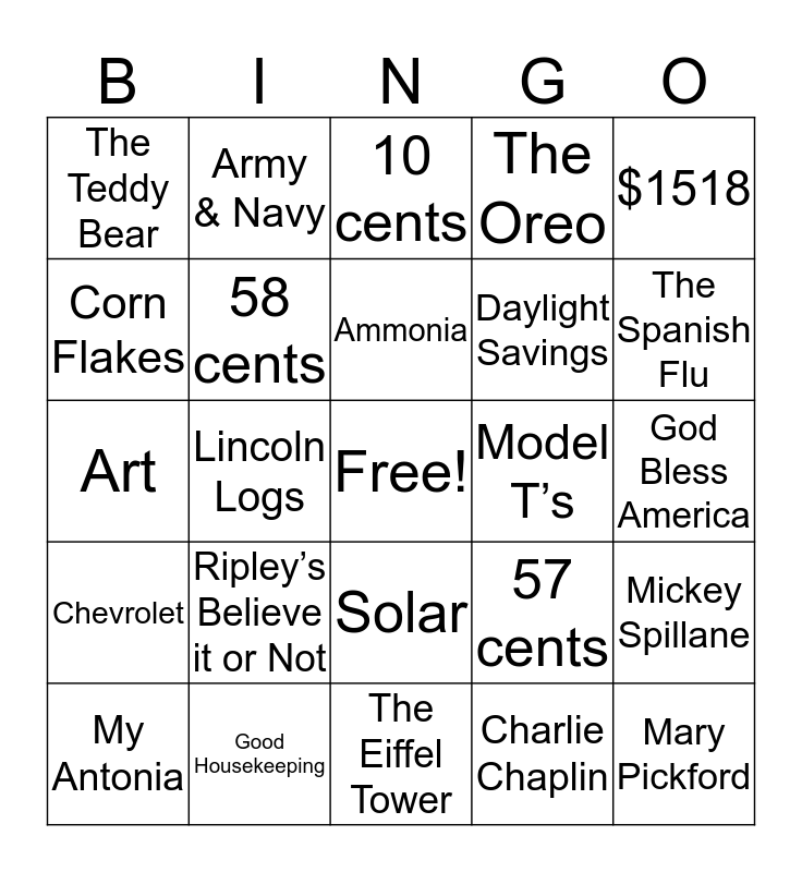 This bingo card has a free space and 31 words: The Eiffel Tower, Woodrow Wilson, Lincoln Logs, Raggedy Ann, The Teddy Bear, 10 cents, 58 cents, 57 cents, Model T’s, Charlie Chaplin, God Bless America, Mary Pickford, Babe Ruth, 3 cents, The Spanish Flu, World War I, Mickey Spillane, Ripley’s Believe it or Not, Chevrolet, Solar, $1518, Airmail, My Antonia, Army & Navy, Daylight Savings, Corn Flakes, The Oreo, Art, Good Housekeeping, Ammonia and The Boston Red Sox.