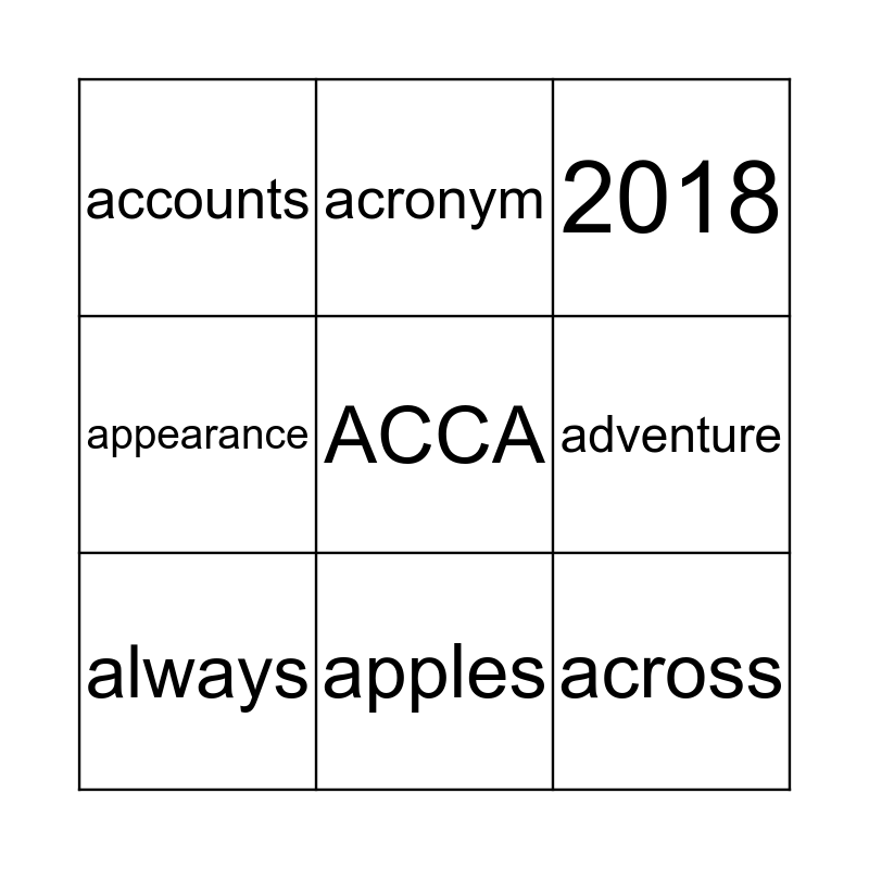 This bingo card has 19 words: Free!, 2012, 2018, 2022, above, ACCA, accountants, accounts, acronym, across, admin, adventure, always, ambition, AMR, appear, appearance, apples and approach.