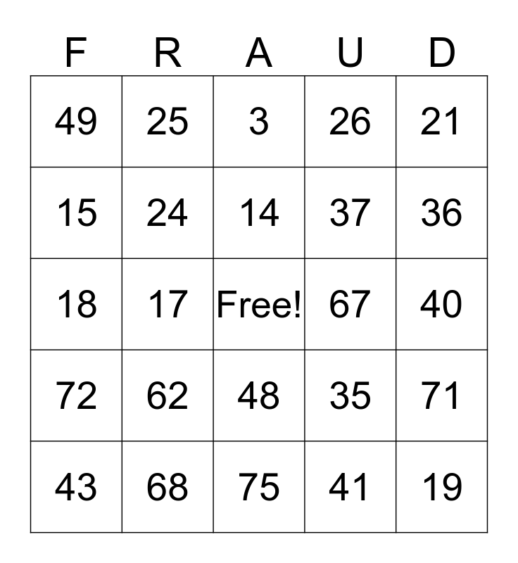 This bingo card has a free space and 75 words: 1, 2, 3, 4, 5, 6, 7, 8, 9, 10, 11, 12, 14, 15, 16, 17, 13, 19, 20, 21, 22, 18, 24, 25, 26, 27, 23, 29, 30, 31, 32, 28, 34, 35, 36, 37, 33, 39, 40, 41, 42, 38, 44, 45, 46, 47, 43, 49, 50, 51, 52, 48, 54, 55, 56, 57, 53, 59, 60, 61, 62, 58, 64, 65, 66, 67, 63, 69, 70, 71, 72, 68, 74, 75 and 73.