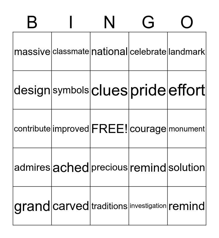 This bingo card has a free space and 24 words: ached, carved, clues, grand, landmark, massive, design, classmate, courage, precious, pride, contribute, remind, solution, symbols, investigation, monument, national, effort, improved, remind, admires, celebrate and traditions.
