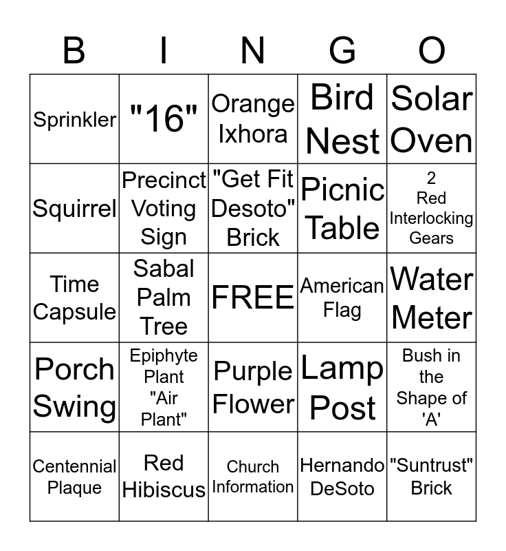 This bingo card has a free space and 24 words: Epiphyte Plant "Air Plant", Red Hibiscus, "Get Fit Desoto" Brick, Centennial Plaque, Solar Oven, Sprinkler, Squirrel, "16", American Flag, Purple Flower, Picnic Table, Time Capsule, Lamp Post, Bush in the Shape of 'A', Precinct Voting Sign, Hernando DeSoto, Water Meter, Orange Ixhora, 2 Red Interlocking Gears, Sabal Palm Tree, "Suntrust" Brick, Porch Swing, Bird Nest and Church Information.