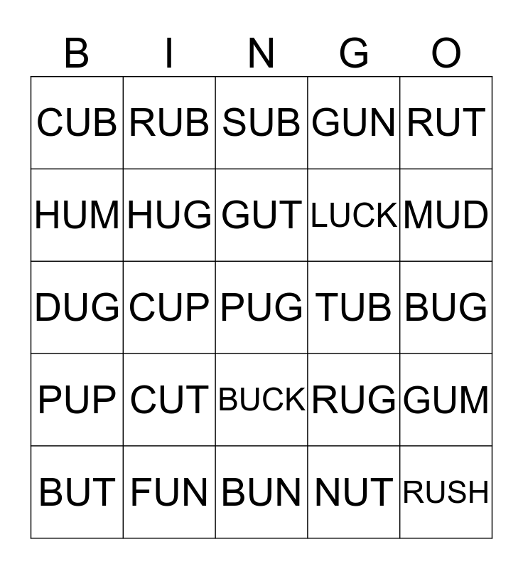 This bingo card has a free space and 24 words: BUT, CUT, GUT, NUT, RUT, CUB, RUB, SUB, TUB, BUG, DUG, HUG, RUG, GUM, HUM, FUN, BUN, GUN, MUD, PUP, CUP, BUCK, LUCK and RUSH.