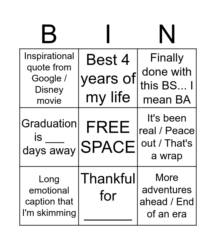 This bingo card has a free space and 8 words: It's been real / Peace out / That's a wrap, Finally done with this BS... I mean BA, Best 4 years of my life, Long emotional caption that I'm skimming, Inspirational quote from Google / Disney movie, More adventures ahead / End of an era, Graduation is ___ days away and Thankful for ______.