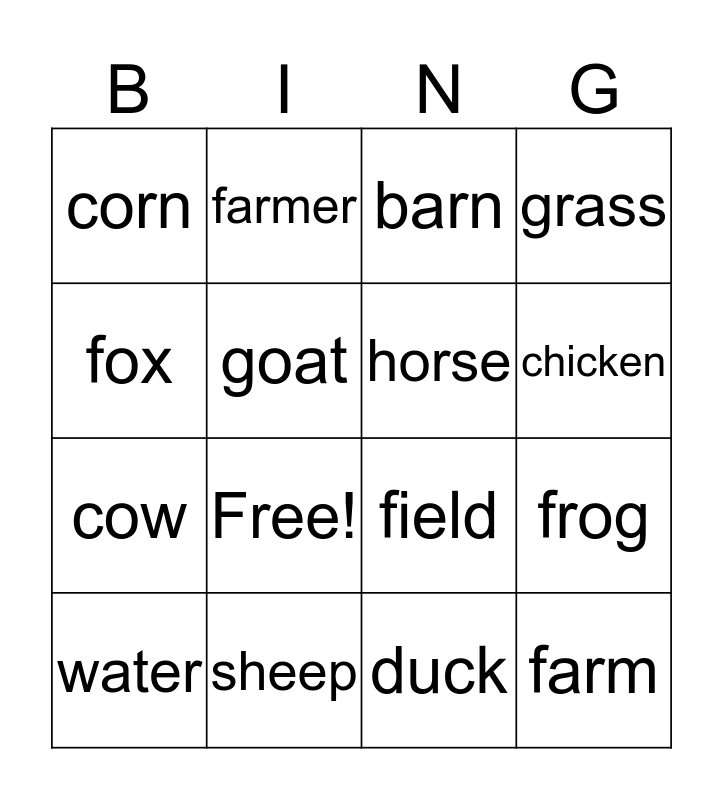 This bingo card has 18 words: Free!, farm, barn, corn, field, grass, water, farmer, chicken, cow, duck, fox, frog, goat, horse, pig, sheep and dog.