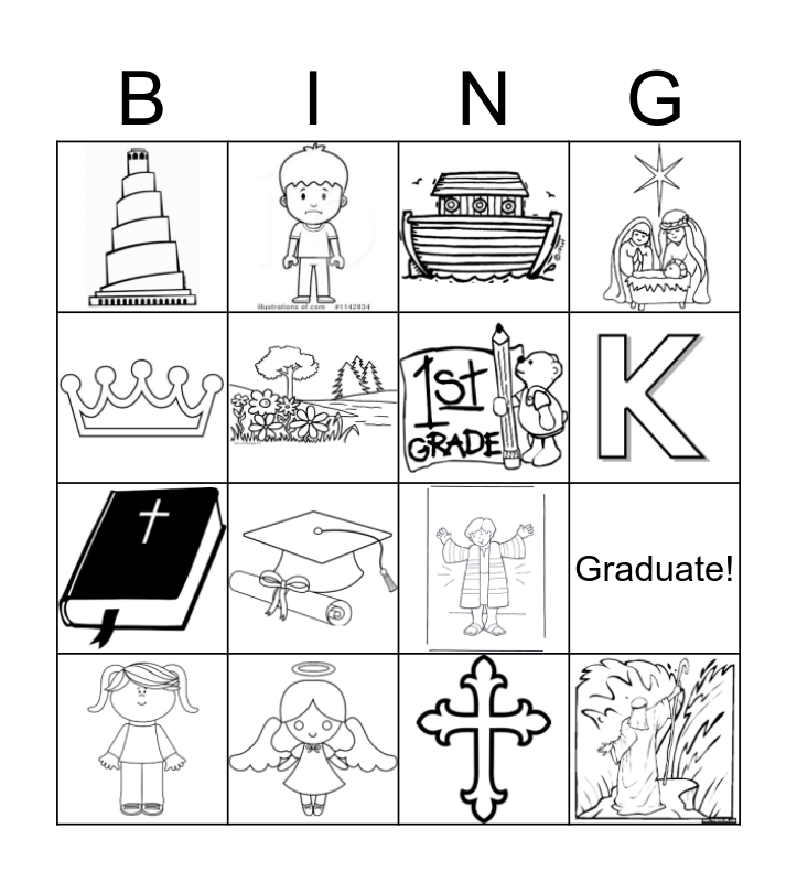 This bingo card has 15 images and 1 words: Graduate!.
