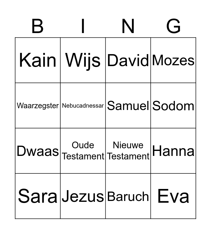 This bingo card has 24 words: Abel, Abraham, Sodom, Jojakim, Waarzegster, Kain, Nebucadnessar, Wijs, Jezus, Goliat, Dwaas, Nieuwe Testament, Saul, Lot, Samuel, Boekrol, Baruch, David, Oude Testament, Hanna, Sara, Eva, Mozes and Petrus.