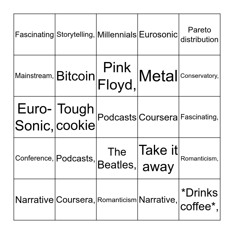 This bingo card has 55 words: Pink Floyd, Narrative, Musicology/Musicologist, Fascinating, Romanticism, Myths, Bitcoin, Documentaries, Metal, Mainstream, Eurosonic, Man, Conference, *drinks coffee*, Iron Maiden, Storytelling, Pareto distribution, Tough cookie, 10,000 hours of practice, Podcasts, Coursera, Ideology/ Ideological, Take it away, Millennials, Conservatory, Pink Floyd,, Narrative,, Musicologist/Musicology,, Fascinating,, Romanticism,, Myths,, Bitcoin,, Documentaries,, Metal,, Mainstream,, Euro-Sonic,, Man,, Conference,, *Drinks coffee*,, Iron Maiden,, Storytelling,, Pareto Distribution,, Tough cookie,, 10.000 hours of practice,, Podcasts,, Coursera,, Ideology/Ideological,, Take it away,, Millennials,, Conservatory,, *Pronounces 'idea' like 'I dear'*,, Python,, Guy(s),, The Beatles, and Rolling Stones,.
