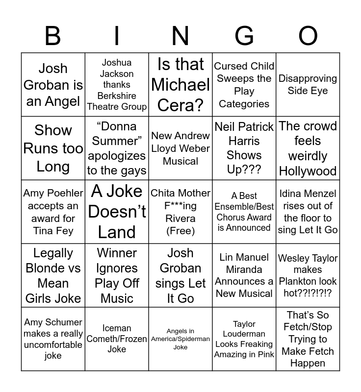 This bingo card has a free space and 68 words: Josh Groban/Sara Bareilles Duet Power Ballad, That’s So Fetch/Stop Trying to Make Fetch Happen, Jessie Mueller gets a standing ovation, Jessie Mueller and Sara Bareilles switch places, Sara Bareilles announces she’s returning to Waitress, Someone makes a Dawson’s Creek Reference, Joshua Jackson thanks Berkshire Theatre Group, Berkshire Theatre Group gets mentioned, New Andrew Lloyd Weber Musical, Laurie F***ing Metcalf, Josh Groban sings Let It Go, Josh Groban sings Let It Go in drag, Idina Menzel rises out of the floor to sing Let It Go, Disapproving Side Eye, Forced Smile from Loser, Show Runs too Long, A Joke Doesn’t Land, Josh Groban is an Angel, Winner Gets Played Off, Winner Ignores Play Off Music, Neil Patrick Harris Shows Up???, Lin Manuel Miranda Announces a New Musical, Legally Blonde vs Mean Girls Joke, Mean Girls: The Movie introduces Mean Girls: The Musical, Incredibly Stale Hamilton Joke, Slightly Stale “Waving Through a Window Joke”, Political Soapboxing, The Spongebob Musical is better than you thought it would be, Wesley Taylor makes Plankton look hot??!?!?!?, The Margaritaville performance is uncomfortably underwhelming, Is that Michael Cera?, Someone hot kisses Andrew Garfield, Michael Cera kisses Andrew Garfield, Ryan Reynold shows up to kiss Andrew Garfield, Cursed Child Sweeps the Play Categories, Cursed Child loses every category, Joey LaBrasca, Amy Schumer makes a really uncomfortable joke, The crowd feels weirdly Hollywood, Amy Poehler accepts an award for Tina Fey, Someone yells “She Doesn’t Even Go Here”, Show ends with “Last Dance” from Summer: The Donna Summer Musical, “Donna Summer” apologizes to the gays, The Band’s Visit performance breaks into an interpretive dance, The Band’s Visit band has a prolonged instrumental break, Josh Groban in Egyptian military uniform, Josh and Sara awkwardly dance to disco music, The Band’s Visit is snubbed, A Best Ensemble/Best Chorus Award is Announced, Iceman Cometh/Frozen Joke, Host in all Pink, Someone Spins their Tony, You wish Rachel Bloom was hosting, Angels in America/Spiderman Joke, Chris Evans/Avengers Joke, Taylor Louderman Doesn’t Wear Pink, Taylor Louderman Looks Freaking Amazing in Pink, Tina Fey SNL joke, Dangerous Cleavage, Four Legged Tap Dance, Celebrity Selfie, Josh Groban Announces They’re Bringing Back Comet, Someone Awkwardly Waves to the Camera, So Many Tears, First Time Nominee Wins, Nominee “Totally Wasn’t Expecting This”, Nominee thanks the other nominees and #TonysSoWhite.