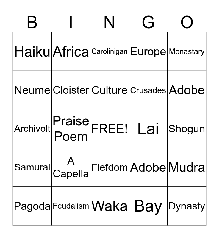 This bingo card has a free space and 24 words: A Capella, Feudalism, Culture, Pagoda, Monastary, Haiku, Neume, Africa, Lai, Fiefdom, Crusades, Archivolt, Adobe, Mudra, Cloister, Bay, Shogun, Carolinigan, Adobe, Praise Poem, Dynasty, Samurai, Europe and Waka.