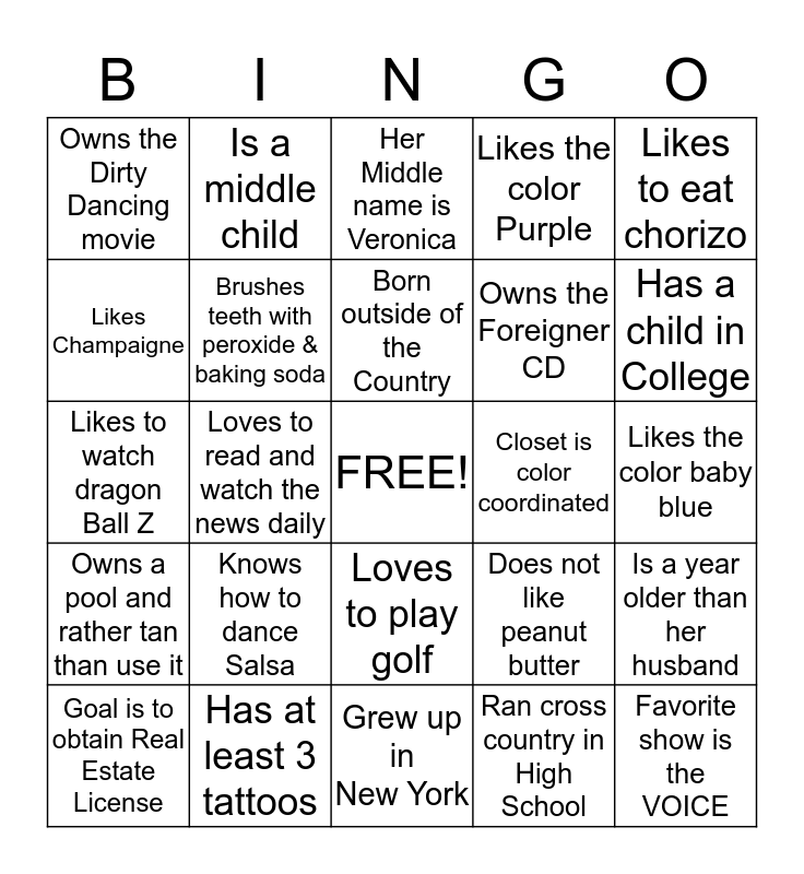 This bingo card has a free space and 24 words: Knows how to dance Salsa, Has at least 3 tattoos, Born outside of the Country, Goal is to obtain Real Estate License, Likes to eat chorizo, Owns the Dirty Dancing movie, Likes Champaigne, Is a middle child, Closet is color coordinated, Loves to play golf, Owns the Foreigner CD, Likes to watch dragon Ball Z, Does not like peanut butter, Is a year older than her husband, Brushes teeth with peroxide & baking soda, Ran cross country in High School, Likes the color baby blue, Her Middle name is Veronica, Has a child in College, Loves to read and watch the news daily, Favorite show is the VOICE, Owns a pool and rather tan than use it, Likes the color Purple and Grew up in New York.