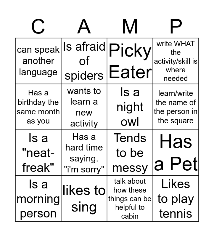 This bingo card has 20 words: Has a Pet, Is left handed, Picky Eater, Enjoys Reading, Is a morning person, Has a birthday the same month as you, likes to sing, can speak another language, Is a "neat-freak", Is afraid of spiders, Has a hard time saying. "i'm sorry", Tends to be messy, wants to learn a new activity, Likes to play tennis, Is a night owl, likes to be the life of the party, learn/write the name of the person in the square, write WHAT the activity/skill is where needed, talk about how these things can be helpful to cabin and life and when challenging, write a solution..