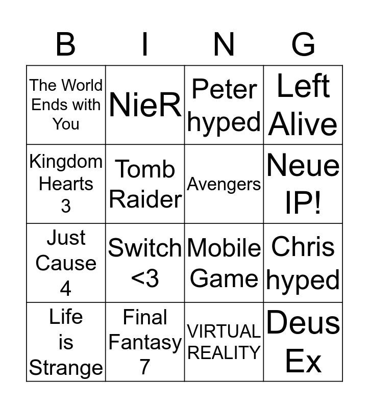 This bingo card has 16 words: Final Fantasy 7, Chris hyped, Peter hyped, The World Ends with You, Just Cause 4, NieR, Mobile Game, VIRTUAL REALITY, Kingdom Hearts 3, Tomb Raider, Life is Strange, Left Alive, Switch <3, Neue IP!, Avengers and Deus Ex.