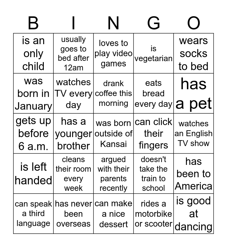 This bingo card has 35 words: hasn't had breakfast today, has won a contest, plays sport on the weekend, watches TV every day, argued with their parents recently, is vegetarian, was born in January, does not like natto, drank coffee this morning, is afraid of insects, gets up before 6 a.m., wears socks to bed, can play a musical instrument, has more than two siblings, is an only child, can click their fingers, rides a motorbike or scooter, has a younger brother, is left handed, was born outside of Kansai, doesn't take the train to school, can speak a third language, has been to America, has never been overseas, loves to play video games, has a pet, is good at dancing, plays games on their smartphone, eats bread every day, watches an English TV show, likes Western pop music, can make a nice dessert, cleans their room every week, usually goes to bed after 12am and has a part-time job.