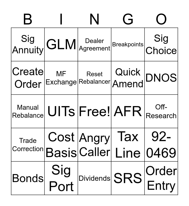This bingo card has a free space and 26 words: Angry Caller, SRS, Reset Rebalancer, Sig Port, Sig Choice, Sig Annuity, Create Order, GLM, Off-Research, Tax Line, Quick Amend, Manual Rebalance, 92-0469, Bonds, UITs, Misdirected, Breakpoints, Trade Correction, Dealer Agreement, Order Entry, DNOS, Dividends, AFR, Cost Basis, MF Exchange and Loan Advance.