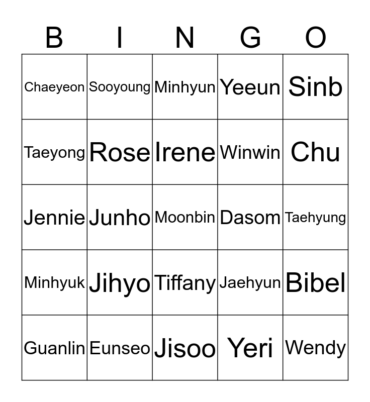 This bingo card has a free space and 24 words: Jihyo, Eunseo, Irene, Guanlin, Sinb, Chaeyeon, Taeyong, Sooyoung, Dasom, Tiffany, Winwin, Jennie, Jaehyun, Bibel, Rose, Yeri, Taehyung, Minhyun, Chu, Junho, Wendy, Minhyuk, Yeeun and Jisoo.