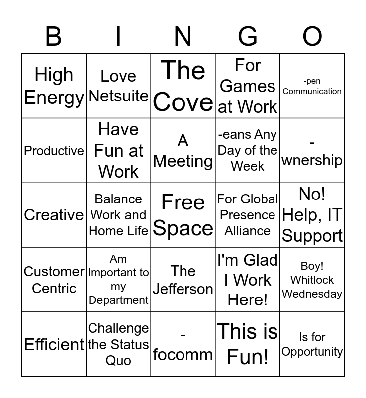 This bingo card has a free space and 24 words: Efficient, Am Important to my Department, A Meeting, This is Fun!, -pen Communication, High Energy, Love Netsuite, The Cove, For Global Presence Alliance, No! Help, IT Support, Creative, Have Fun at Work, I'm Glad I Work Here!, Boy! Whitlock Wednesday, Productive, Challenge the Status Quo, -focomm, For Games at Work, -wnership, Customer Centric, Balance Work and Home Life, The Jefferson, -eans Any Day of the Week and Is for Opportunity.
