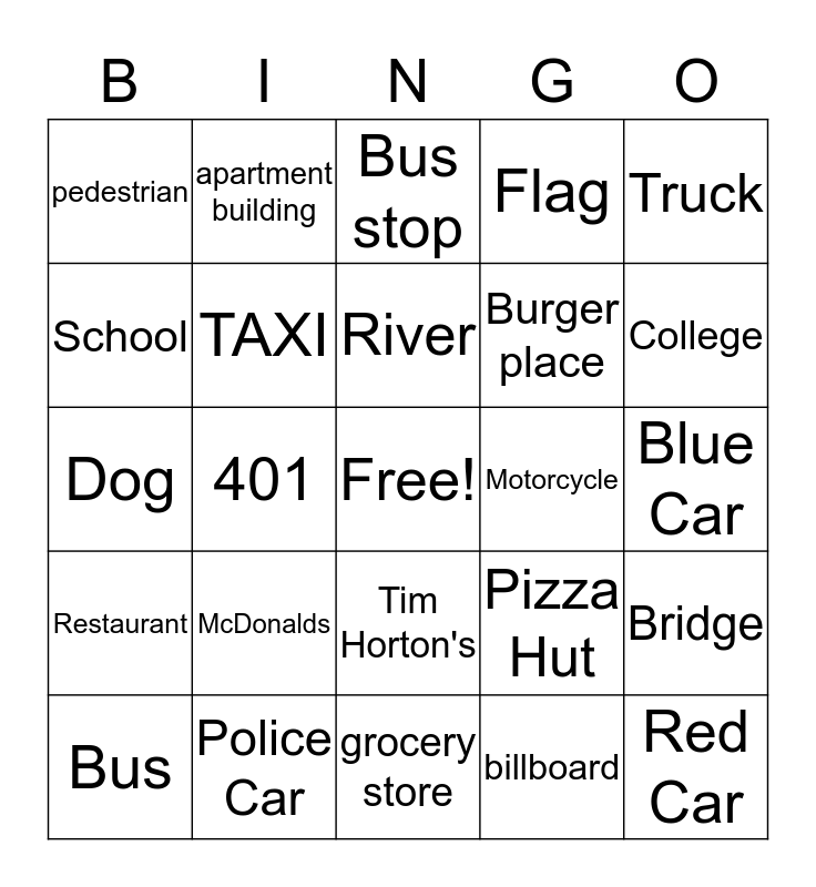 This bingo card has a free space and 24 words: McDonalds, Police Car, River, Bus, Truck, pedestrian, School, apartment building, Motorcycle, Tim Horton's, Burger place, Dog, Pizza Hut, Bridge, TAXI, billboard, Blue Car, Bus stop, College, 401, Red Car, Restaurant, Flag and grocery store.