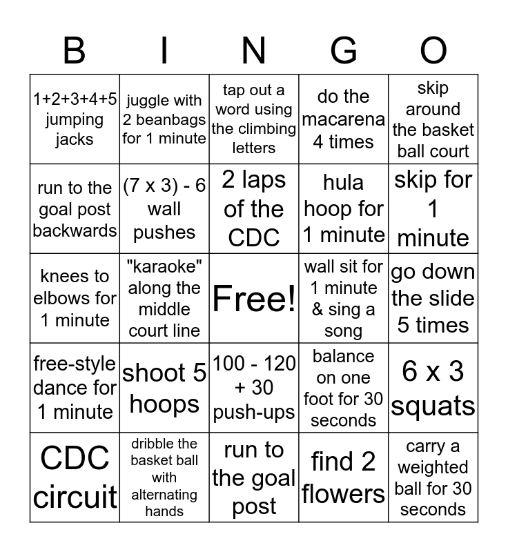 This bingo card has a free space and 24 words: shoot 5 hoops, dribble the basket ball with alternating hands, 2 laps of the CDC, CDC circuit, skip around the basket ball court, 1+2+3+4+5 jumping jacks, run to the goal post backwards, juggle with 2 beanbags for 1 minute, wall sit for 1 minute & sing a song, 100 - 120 + 30 push-ups, hula hoop for 1 minute, knees to elbows for 1 minute, balance on one foot for 30 seconds, 6 x 3 squats, (7 x 3) - 6 wall pushes, find 2 flowers, go down the slide 5 times, tap out a word using the climbing letters, skip for 1 minute, "karaoke" along the middle court line, carry a weighted ball for 30 seconds, free-style dance for 1 minute, do the macarena 4 times and run to the goal post.