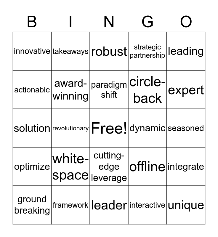 This bingo card has a free space and 24 words: white-space, framework, paradigm shift, ground breaking, leading, innovative, actionable, takeaways, dynamic, cutting-edge leverage, circle-back, solution, offline, integrate, award-winning, interactive, seasoned, robust, expert, revolutionary, unique, optimize, strategic partnership and leader.