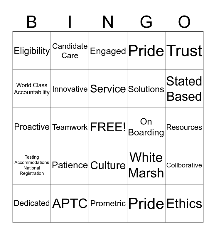 This bingo card has a free space and 27 words: White Marsh, POC, Solutions, Prometric, World Class Accountability, Engaged, Candidate Care, Testing Accommodations National Registration, On Boarding, Collborative, Proactive, Pride, Dedicated, APTC, Stated Based, RS, Innovative, Service, Patience, Eligibility, Resources, Pride, Teamwork, Ethics, Culture, Trust and QWLT.