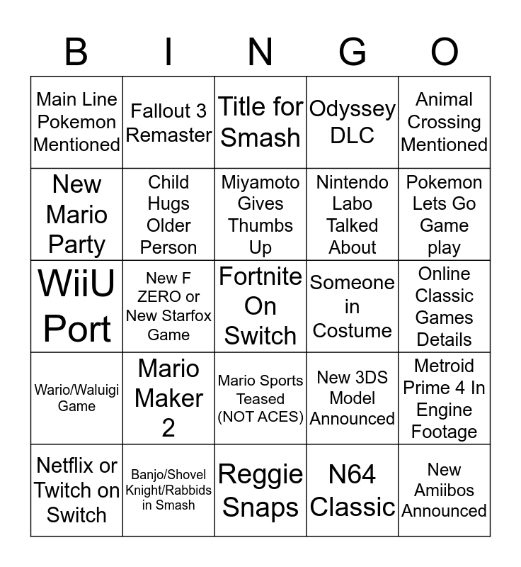 This bingo card has a free space and 24 words: Mario Maker 2, Banjo/Shovel Knight/Rabbids in Smash, Miyamoto Gives Thumbs Up, Netflix or Twitch on Switch, Animal Crossing Mentioned, Main Line Pokemon Mentioned, New Mario Party, Fallout 3 Remaster, Someone in Costume, Mario Sports Teased (NOT ACES), Nintendo Labo Talked About, WiiU Port, New 3DS Model Announced, Metroid Prime 4 In Engine Footage, Child Hugs Older Person, N64 Classic, Online Classic Games Details, Title for Smash, Pokemon Lets Go Game play, New F ZERO or New Starfox Game, New Amiibos Announced, Wario/Waluigi Game, Odyssey DLC and Reggie Snaps.