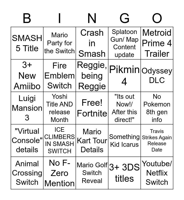 This bingo card has a free space and 24 words: ICE CLIMBERS IN SMASH SWITCH, No F-Zero Mention, Reggie, being Reggie, Animal Crossing Switch, Metroid Prime 4 Trailer, SMASH 5 Title, 3+ New Amiibo, Mario Party for the Switch, "Its out Now!/ After this direct!", Mario Kart Tour Details, Pikmin 4, Luigi Mansion 3, Something Kid Icarus, Travis Strikes Again Release Date, Fire Emblem Switch, 3+ 3DS titles, No Pokemon 8th gen info, Crash in Smash, Odyssey DLC, Yoshi Title AND release Month, Youtube/ Netflix Switch, "Virtual Console" details, Splatoon Gun/ Map Content update and Mario Golf Switch Reveal.