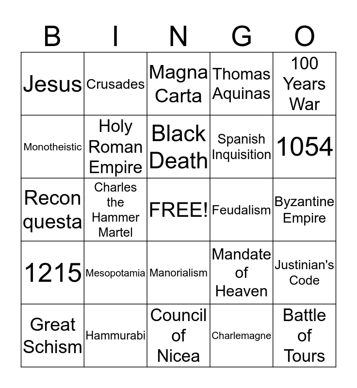 This bingo card has a free space and 24 words: Mesopotamia, Hammurabi, Black Death, Great Schism, 100 Years War, Jesus, Monotheistic, Crusades, Feudalism, Manorialism, Spanish Inquisition, Recon questa, Mandate of Heaven, Justinian's Code, Holy Roman Empire, Charlemagne, Byzantine Empire, Magna Carta, 1054, Charles the Hammer Martel, Battle of Tours, 1215, Thomas Aquinas and Council of Nicea.