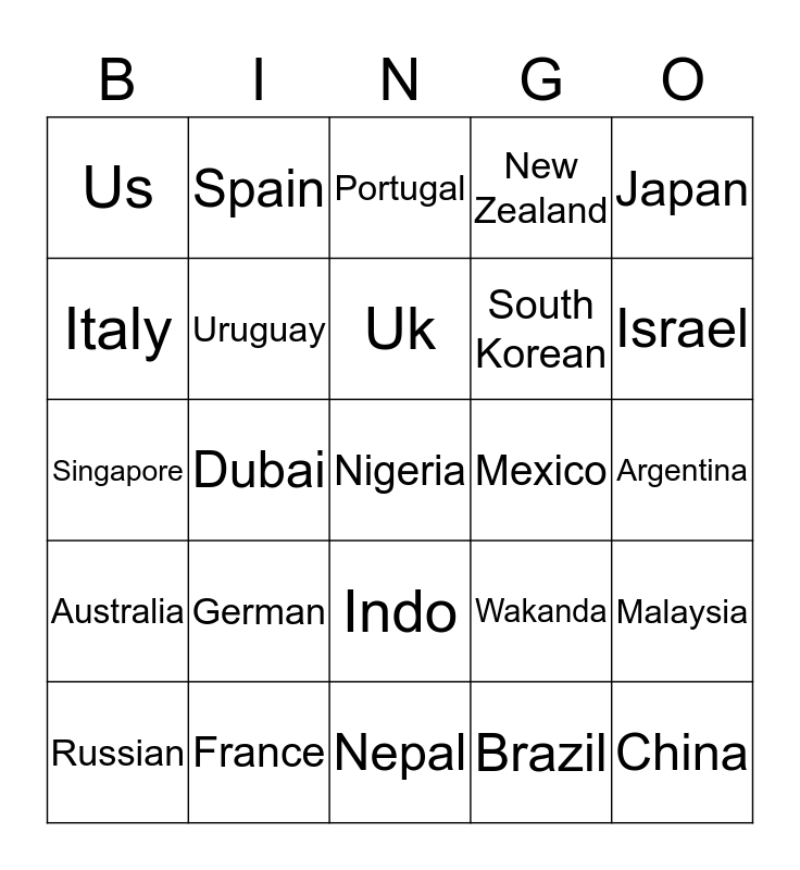 This bingo card has a free space and 24 words: German, France, Uk, Russian, Japan, Us, Italy, Spain, Mexico, Indo, South Korean, Singapore, Wakanda, Malaysia, Uruguay, Brazil, Argentina, Portugal, Israel, Dubai, China, Australia, New Zealand and Nepal.