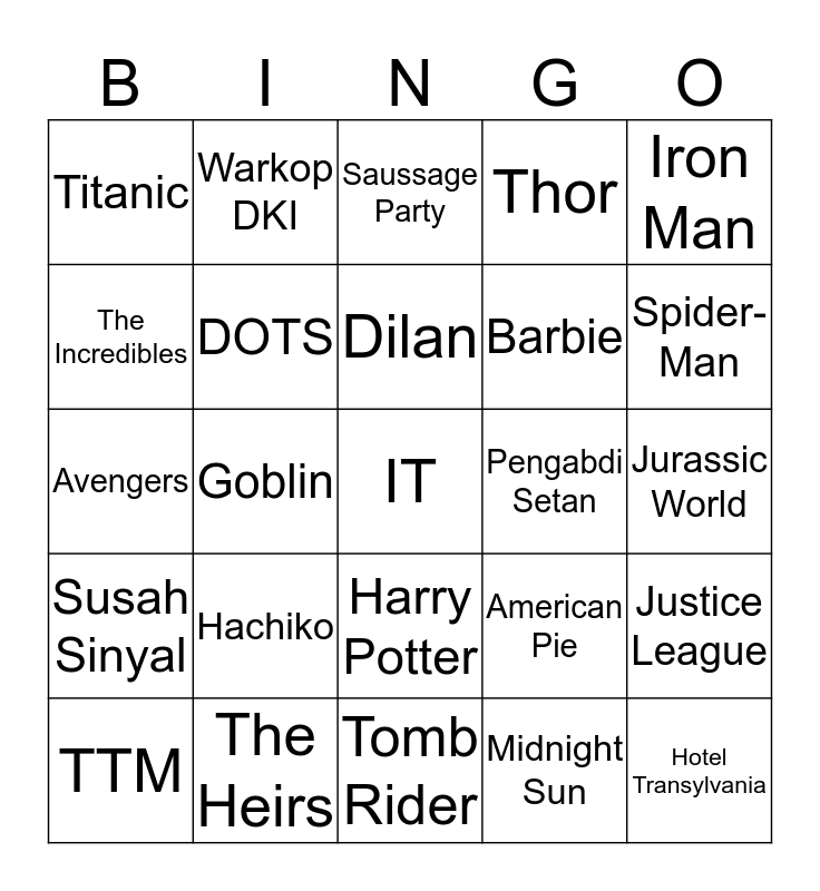 This bingo card has a free space and 24 words: Hachiko, The Heirs, Dilan, TTM, Iron Man, Titanic, The Incredibles, Warkop DKI, Pengabdi Setan, Harry Potter, Barbie, Avengers, American Pie, Justice League, DOTS, Midnight Sun, Jurassic World, Saussage Party, Spider-Man, Goblin, Hotel Transylvania, Susah Sinyal, Thor and Tomb Rider.
