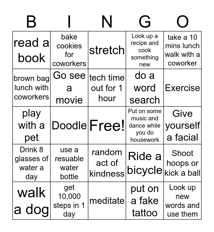 This bingo card has a free space and 24 words: use a resuable water bottle, get 10,000 steps in 1 day, tech time out for 1 hour, walk a dog, take a 10 mins lunch walk with a coworker, read a book, brown bag lunch with coworkers, bake cookies for coworkers, Put on some music and dance while you do housework, random act of kindness, do a word search, play with a pet, Ride a bicycle, Shoot hoops or kick a ball, Go see a movie, put on a fake tattoo, Give yourself a facial, stretch, Exercise, Doodle, Look up new words and use them, Drink 8 glasses of water a day, Look up a recipe and cook something new and meditate.
