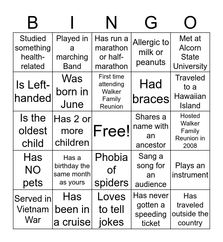 This bingo card has a free space and 24 words: Has a birthday the same month as yours, Has been in a cruise, First time attending Walker Family Reunion, Served in Vietnam War, Met at Alcorn State University, Studied something health-related, Is Left-handed, Played in a marching Band, Shares a name with an ancestor, Phobia of spiders, Had braces, Is the oldest child, Sang a song for an audience, Plays an instrument, Was born in June, Has never gotten a speeding ticket, Hosted Walker Family Reunion in 2008, Has run a marathon or half-marathon, Traveled to a Hawaiian Island, Has 2 or more children, Has traveled outside the country, Has NO pets, Allergic to milk or peanuts and Loves to tell jokes.