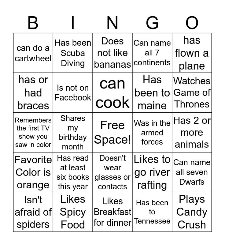 This bingo card has a free space and 24 words: Has read at least six books this year, Likes Spicy Food, can cook, Isn't afraid of spiders, has flown a plane, can do a cartwheel, has or had braces, Has been Scuba Diving, Was in the armed forces, Doesn't wear glasses or contacts, Has been to maine, Remembers the first TV show you saw in color, Likes to go river rafting, Can name all seven Dwarfs, Is not on Facebook, Has been to Tennessee, Has 2 or more animals, Does not like bananas, Watches Game of Thrones, Shares my birthday month, Plays Candy Crush, Favorite Color is orange, Can name all 7 continents and Likes Breakfast for dinner.