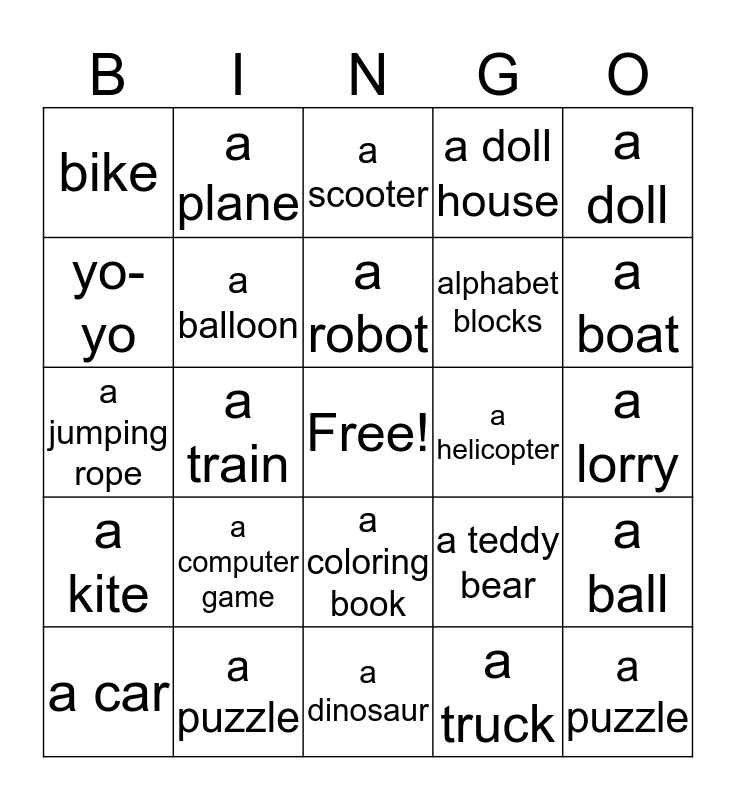 This bingo card has a free space and 24 words: a computer game, a puzzle, a robot, a car, a doll, bike, yo-yo, a plane, a helicopter, a coloring book, alphabet blocks, a jumping rope, a teddy bear, a ball, a balloon, a truck, a lorry, a scooter, a boat, a train, a puzzle, a kite, a doll house and a dinosaur.